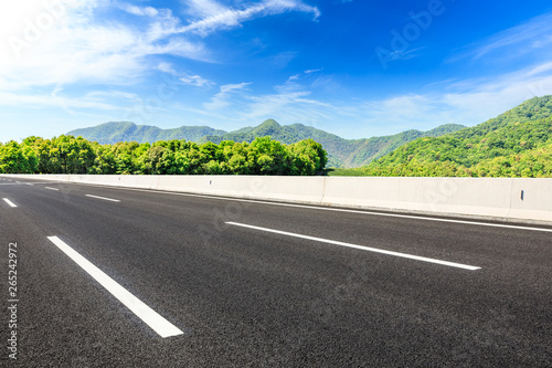 © ABCDstock, Fototapeta premium Country road and green mountains natural landscape under the blue sky