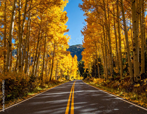 © YUSODA, Obraz premium Country Road Autumn Forest Valley Golden Trees Travel Photography