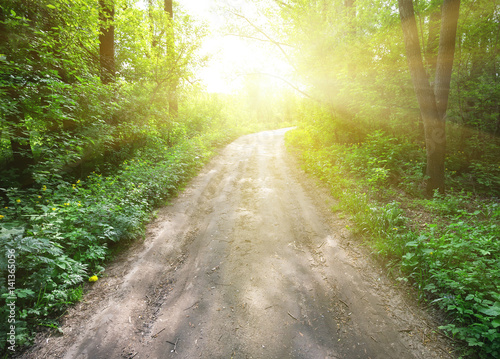 © alexlukin, Fototapeta premium Country road in a green forest leading to sun