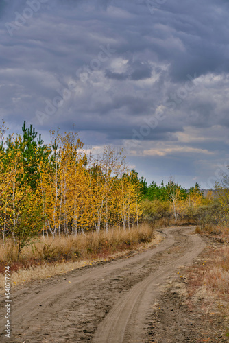 © freeman83, Fototapeta premium Country road in an autumn pine birch forest against backdrop dramatic clouds.
