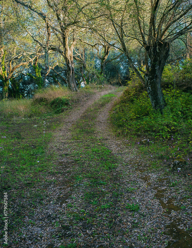 Fototapeta premium Country road in olive grove. Corfu island, Greece.
