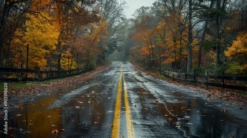 © FryArt, Obraz premium Country road surrounded by autumn trees on a cloudy rainy day
