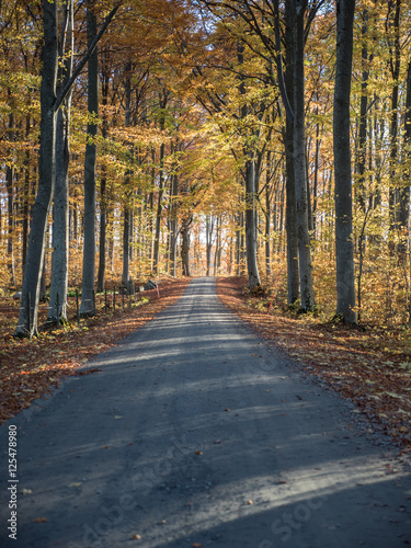 Fototapeta premium Country road surrounded by colorful beech wood in autumn