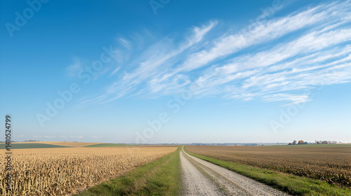 Naklejka premium Country Road Through Golden Cornfields Under Clear Blue Sky