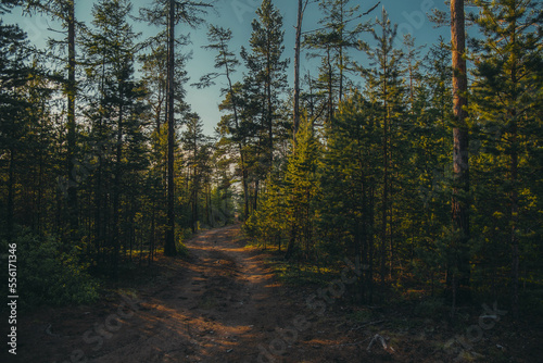 © Дмитрий Ткачев, Fototapeta premium country road through the forest, the sun's rays break through the branches