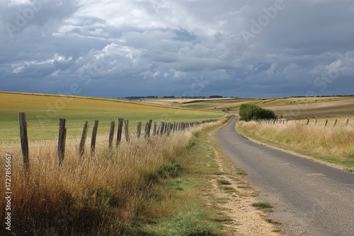 © inas, Fototapeta premium Country road winding through open fields under cloudy sky