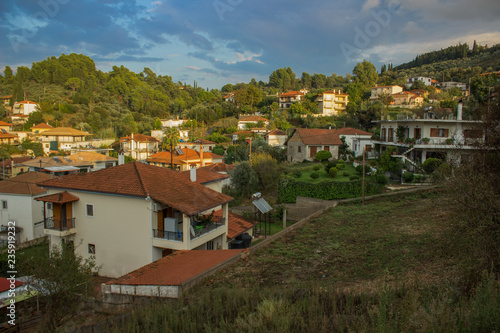 © Artem Kniaz, Obraz premium country side space village in mountain forest south nature landscape environment in Mediterranean district of Earth in soft colors evening time