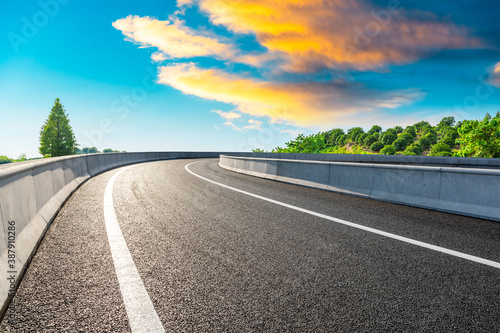 © ABCDstock, Fototapeta premium Countryside asphalt road and green tea plantations with mountain natural scenery in Hangzhou at sunrise.