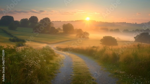Obraz premium countryside at sunrise, with sunlit grass reflecting the warm hues of the morning light, a misty horizon adding a sense of calm