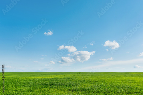 Obraz premium Countryside field natural background. Green grass and blue sky.