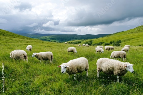 Obraz premium Countryside grazing sheep outdoors.