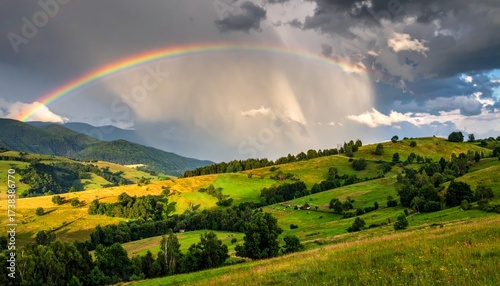 Obraz premium countryside hilly landscape with dark clouds and a vibrant rainbow