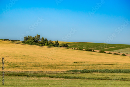 © Reflexpixel, Obraz premium Countryside landscape with sky and fields, real life photo