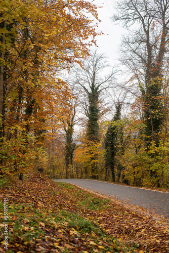 © MariaEugenia, Obraz premium Countryside road in autumn forest