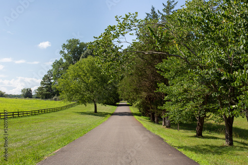© Bryan, Fototapeta premium Countryside road summer green scenery blue sky wood fence