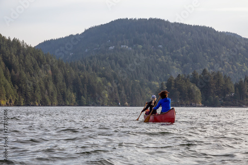 Naklejka premium Couple adventurous female friends on a red canoe are paddling in the Howe Sound during a cloudy and sunny evening. Taken near Bowen Island, West of Vancouver, BC, Canada.