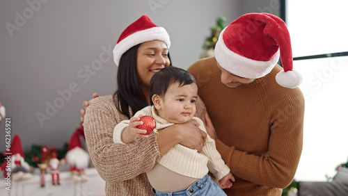 © Krakenimages.com, Fototapeta premium Couple and son holding decoration ball standing by christmas tree at home