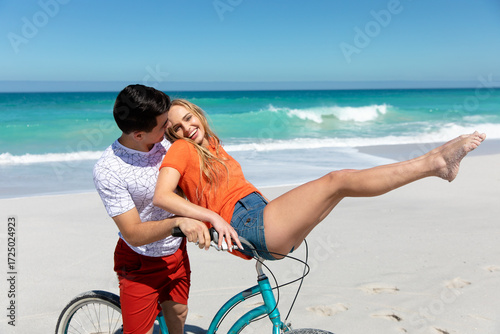 © wavebreak3, Fototapeta premium Couple balancing teal cruiser bicycle on white sand beach next to turquoise ocean waves
