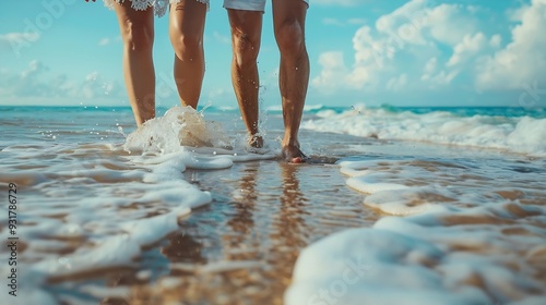 © Generative AI, Fototapeta premium Couple beach and holding hands in running happy and holiday for vacation ocean and cropped shot Romantic summer and travel bonding and sea or outdoor sand and romance in miami for hone : Generative AI