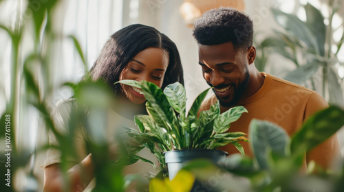 Obraz premium Couple caring houseplants at home. African american young adult man and woman...