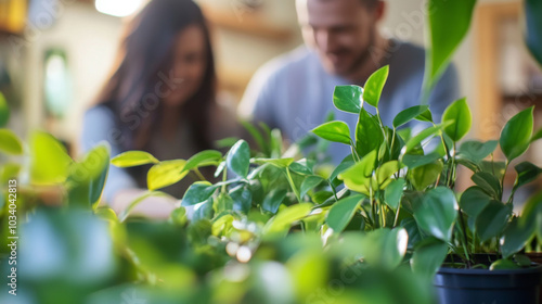 © dvoevnore, Obraz premium Couple caring houseplants at home. Caucasian middle aged man and woman with green plants