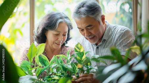 Obraz premium Couple caring houseplants at home. Multiracial mature man and woman with green plants