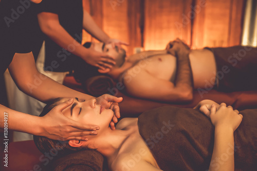 © InfiniteFlow, Obraz premium Couple customer enjoying relaxing anti-stress head massage and pampering facial beauty skin recreation leisure in warm candle lighting ambient salon spa in luxury resort or hotel. Quiescent