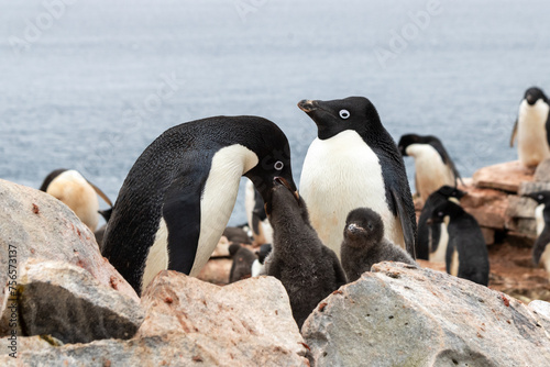 Naklejka premium Couple de manchots d'Adélie nourrissant un petit en Antarctique Janvier 2024