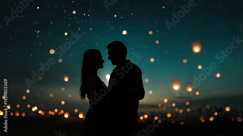 © Esmari, Obraz premium Couple embraces under a starry sky filled with glowing lanterns during a romantic evening
