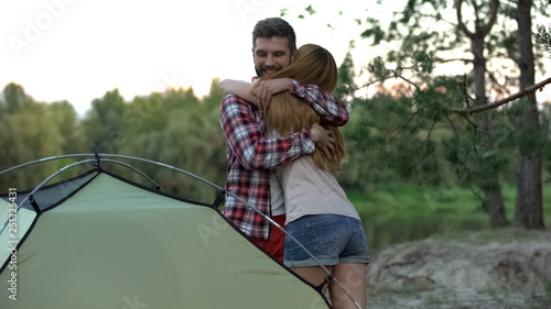 © motortion, Obraz premium Couple embracing, putting up tent, great teamwork, wilderness survival school