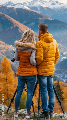 © sergio, Naklejka premium Couple enjoying the view from a mountaintop. AI.
