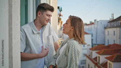 Obraz premium Couple enjoying urban date in evening. Romantic spouses talking on balcony