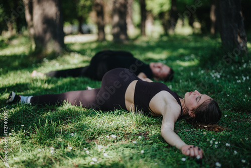 Fototapeta premium Couple enjoys a relaxing moment lying in a peaceful forested area during daytime. The nature scenery conveys calmness and serenity.
