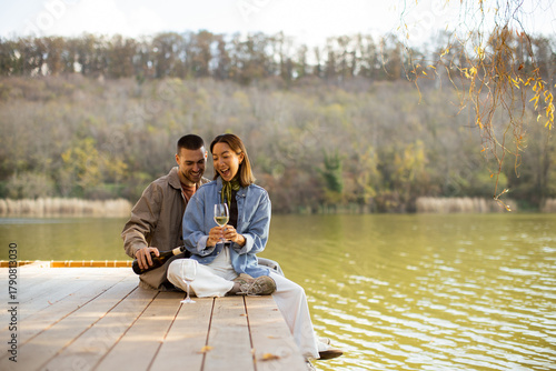© BGStock72, Naklejka premium Couple enjoys a romantic moment by the serene lake during a sunny afternoon