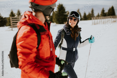 © BGStock72, Fototapeta premium Couple enjoys a winter day while skiing on a snowy mountain trail in the afternoon
