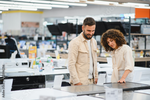 © Serhii, Obraz premium Couple exploring home appliances in electronics store