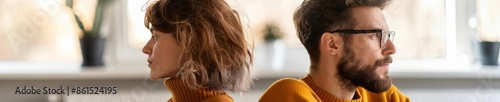 Obraz premium Couple facing away from each other on couch, natural daylight, mid-angle,...