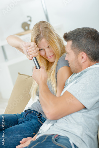 © auremar, Obraz premium Couple fighting over remote control