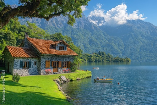 © kardaska, Naklejka premium Couple fishing on a mountain lake with a stone cottage
