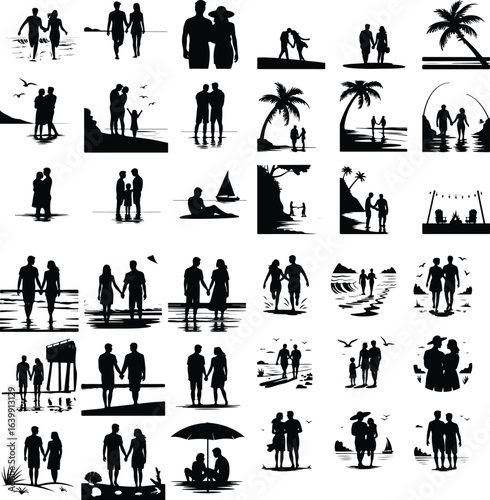 © logodesign11, Naklejka premium Couple Holding Hands at Beach Silhouette – Romantic Ocean Icon Set Lovers Walking on Shore Silhouette – Beach Romance Icon