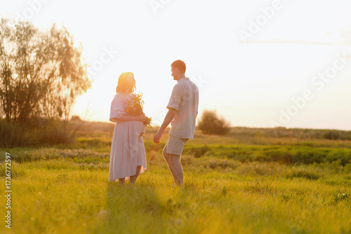 © Maksym, Fototapeta premium Couple holding hands in a sunlit field, sharing a tender moment together during sunset