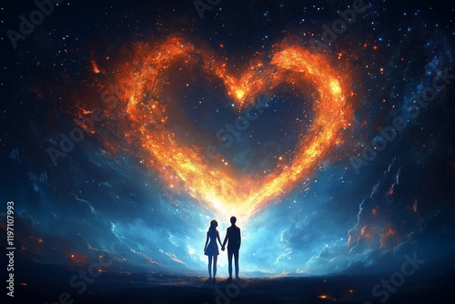 Fototapeta premium Couple holds hands under a glowing heart of stars in a cosmic landscape