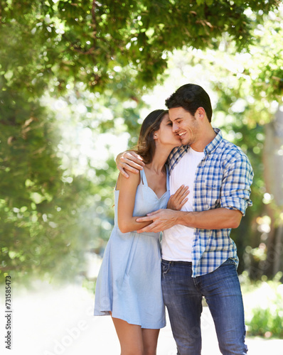 Fototapeta premium Couple, hug and happy in park with kiss in summer for partnership together or...