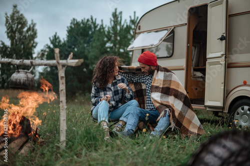 Obraz premium Couple in a checkered plaid roasting marshmallows on fire near the trailer home.