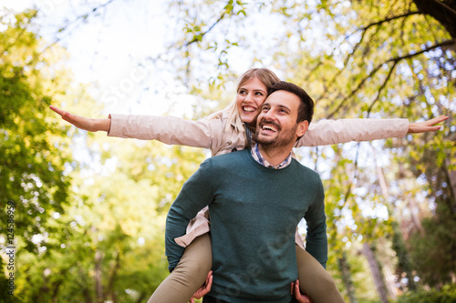 © NDABCREATIVITY, Obraz premium Couple in love feeling happy outdoors