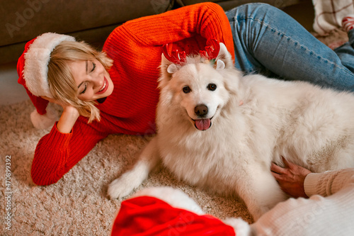 © Valerii Apetroaiei, Fototapeta premium Couple in love for New Year and Christmas with a dog at home