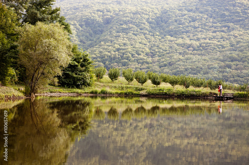 Fototapeta premium Couple in love on the shore of Lake Forest
