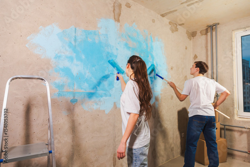 © Юлия Завалишина, Obraz premium Couple in new home during repair works painting wall together. Happy family holding paint roller painting wall with blue color paint in new house. Home renovation DIY renew home concept