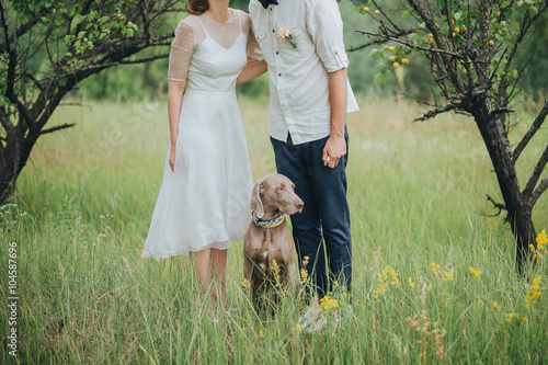 © AlexGukalovUkraine, Obraz premium couple in wedding attire and hunting dog breed are in the field at sunset