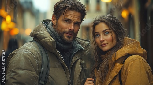 © Pawon.STD, Fototapeta premium Couple in winter coats standing on a street with blurred buildings behind them.
